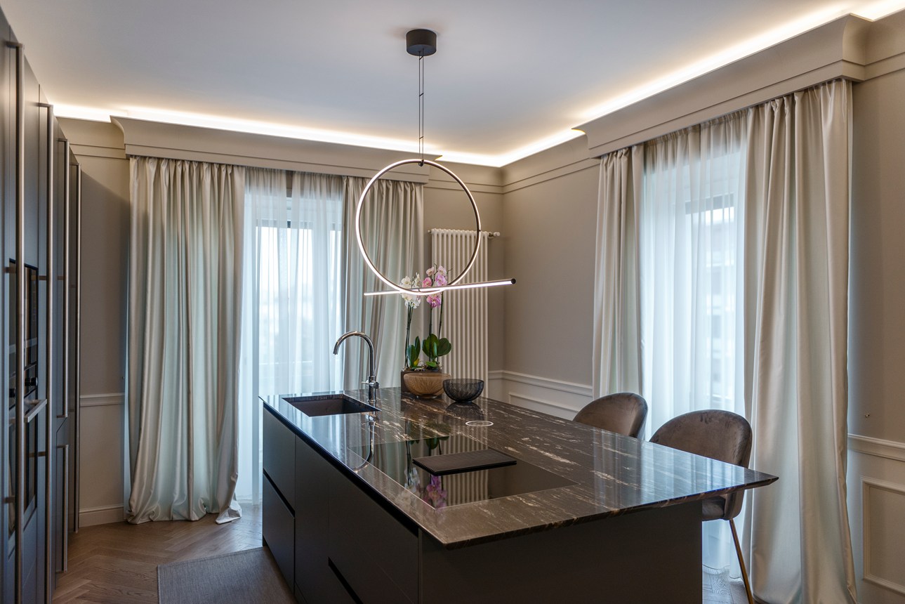 Cornisas, guardasillas, zócalos y decoración mural que se combinan con la iluminación directa o indirecta para crear un ambiente