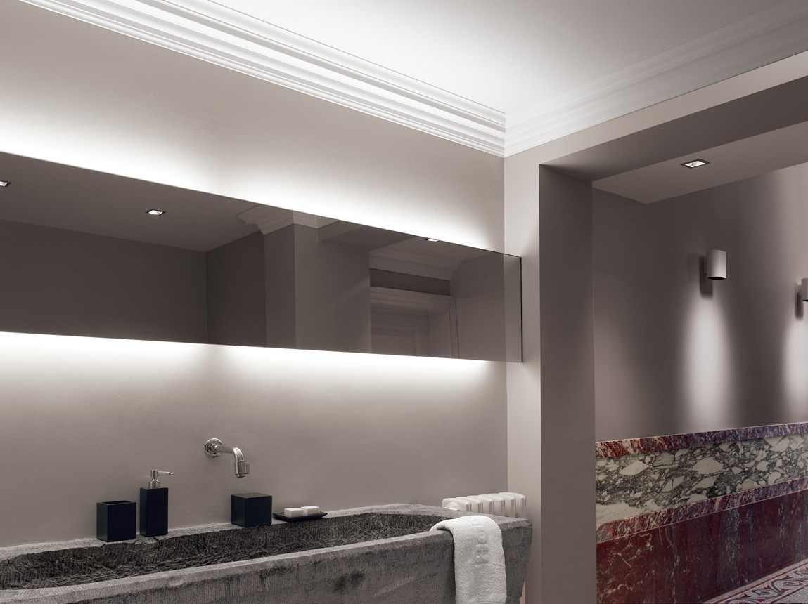 Cornisas, guardasillas, zócalos y decoración mural que se combinan con la iluminación directa o indirecta para crear un ambiente