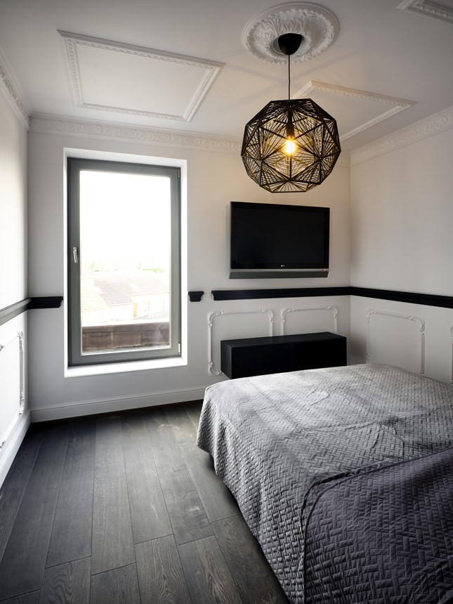 Decoração de parede com painéis de parede, revestimento, rosetas e rodapés para dar um toque moderno ao seu interior.