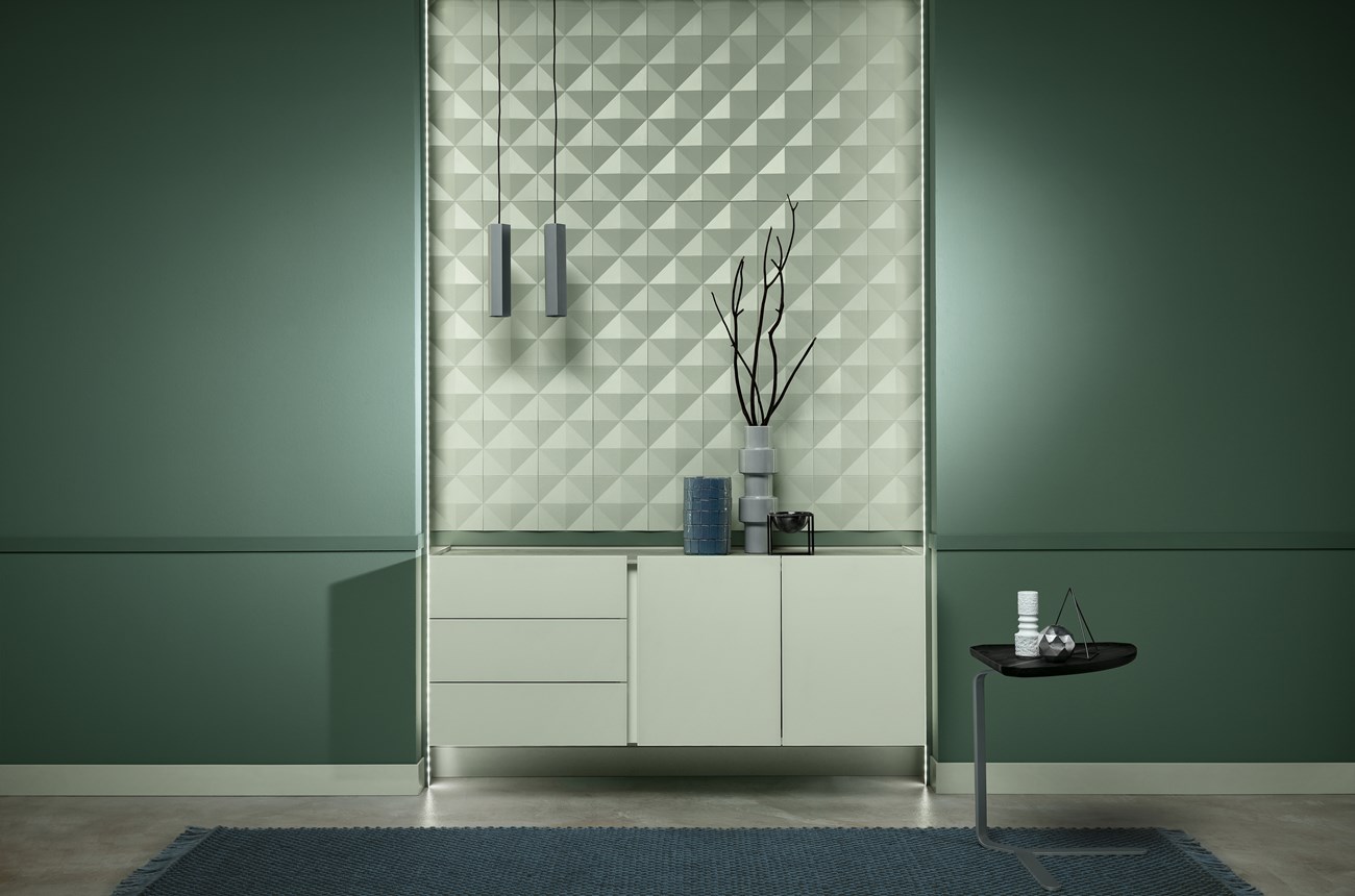 Cornijas, guardas, rodapés e decoração de parede que combinam com iluminação direta ou indireta. Para criar uma atmosfera