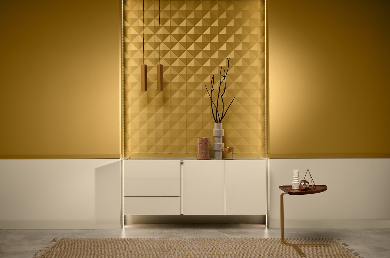 Decoração de parede com painéis de parede, revestimento, rosetas e rodapés para dar um toque moderno ao seu interior.