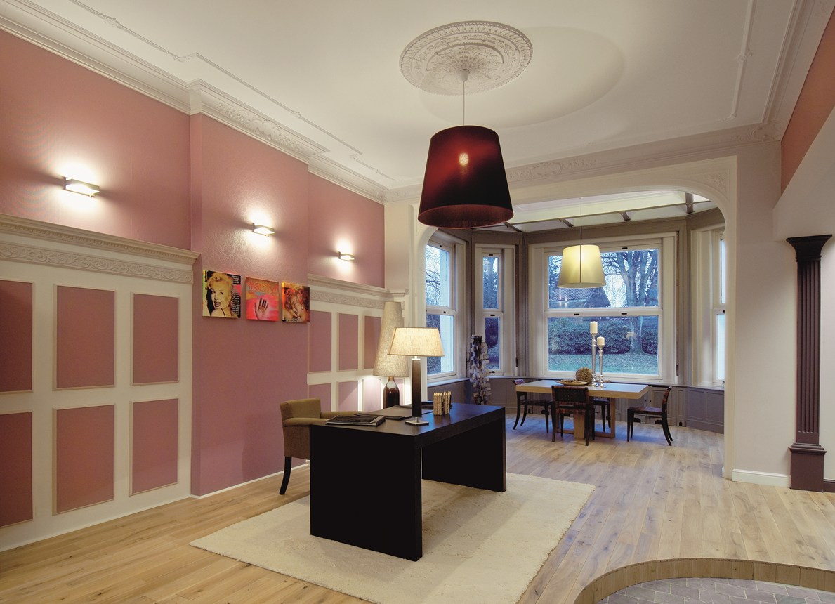 Decoração de parede com painéis de parede, revestimento, rosetas e rodapés para dar um toque moderno ao seu interior.