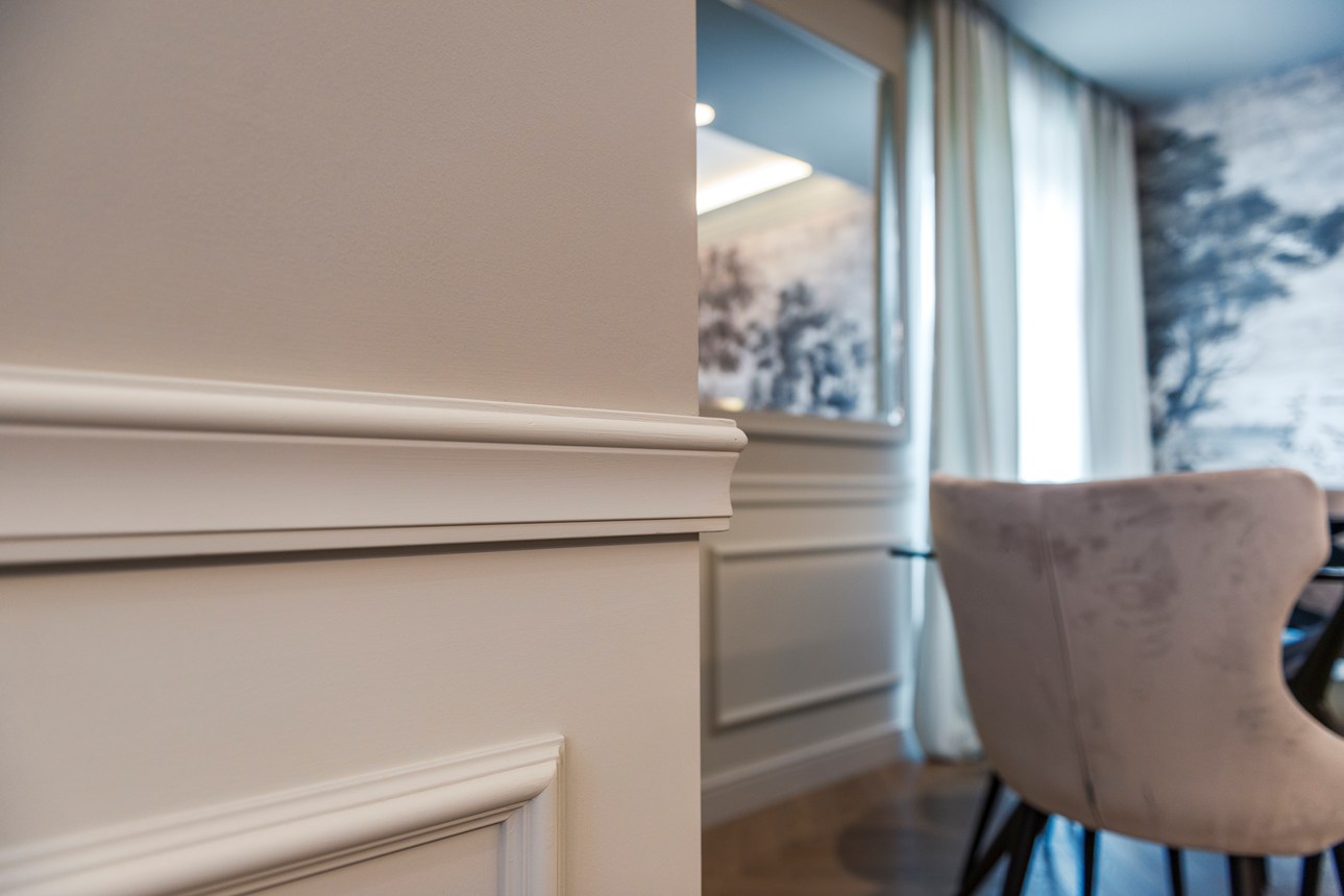 Decoração de parede com painéis de parede, revestimento, rosetas e rodapés para dar um toque moderno ao seu interior.