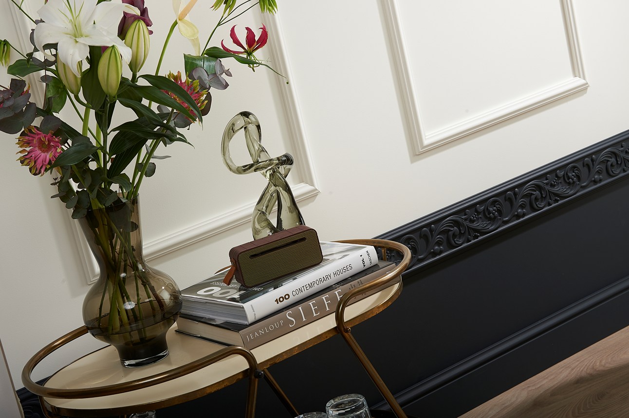 Decoração de parede com painéis de parede, revestimento, rosetas e rodapés para dar um toque moderno ao seu interior.