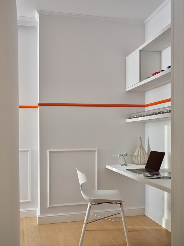 Cornijas, guardas, rodapés e decoração de parede que combinam com iluminação direta ou indireta. Para criar uma atmosfera