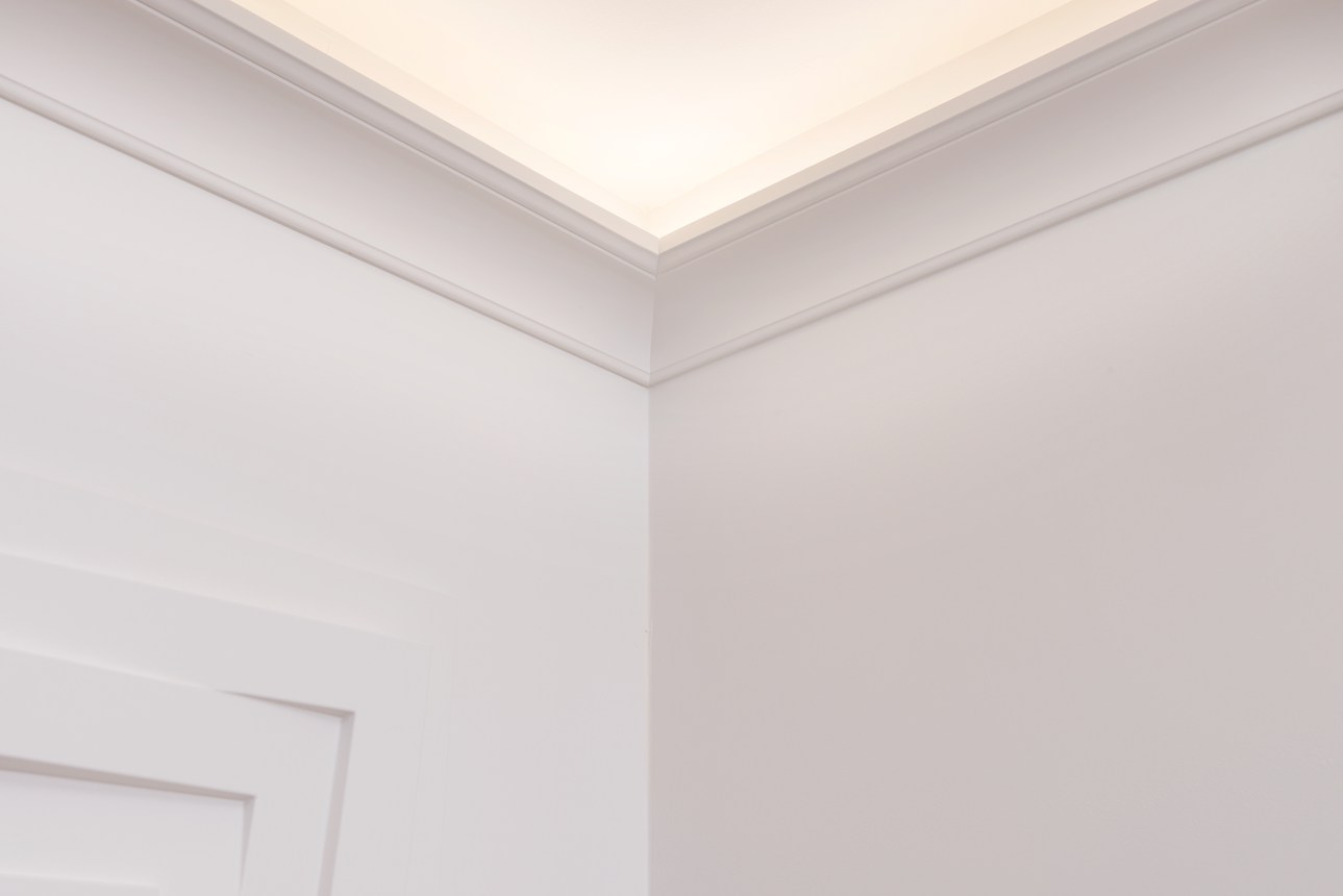 Cornijas, guardas, rodapés e decoração de parede que combinam com iluminação direta ou indireta. Para criar uma atmosfera